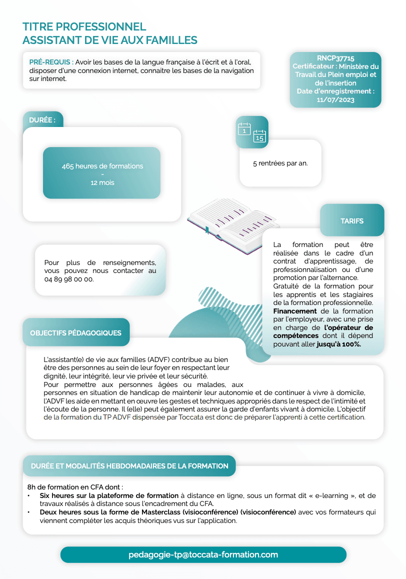 Le TP Assistant de vie aux Familles (ADVF) est une certification professionnelle inscrit au RNCP de niveau 3, qui permet d’avoir de nombreuses possibilités professionnelles dans le secteur de l’aide à domicile et du soutien familiale. Le titulaire de cette certification peut effectuer divers métiers, tels que : assistant de vie aux familles, intervenant à domicile pour l’aide aux personnes âgées, aux personnes handicapées ou dépendants, auxiliaire parentale avec des enfants, ou aide ménager.